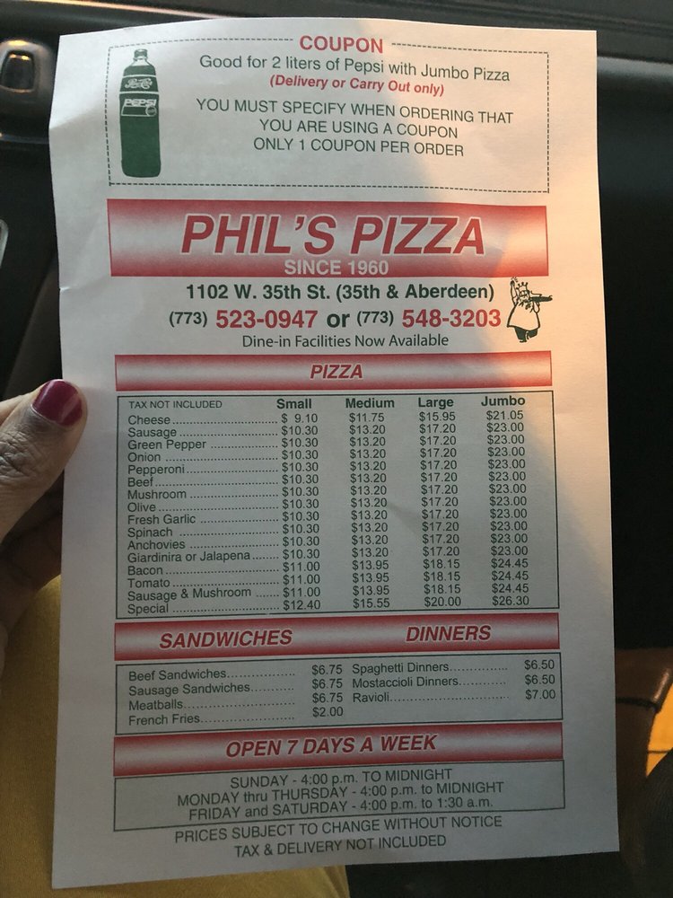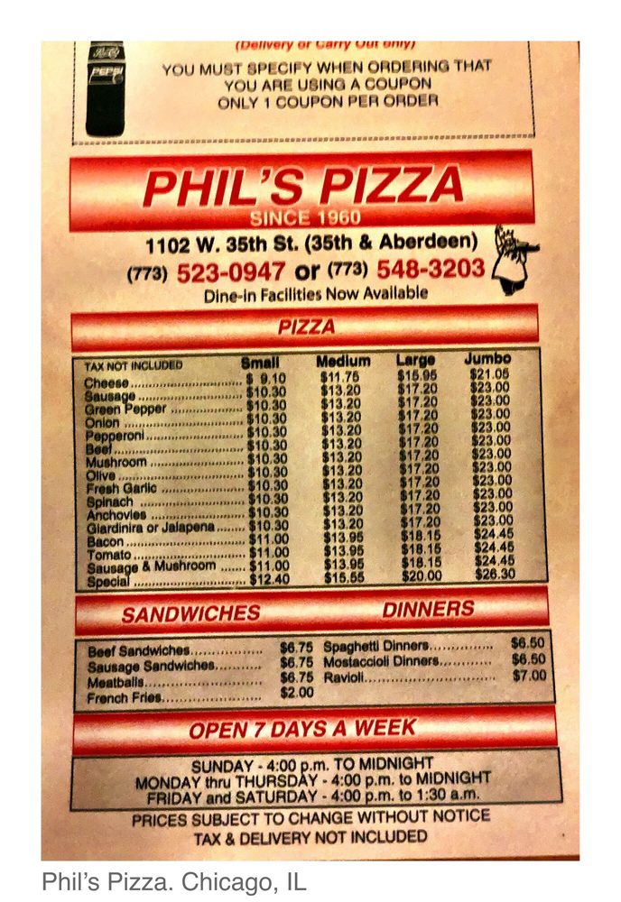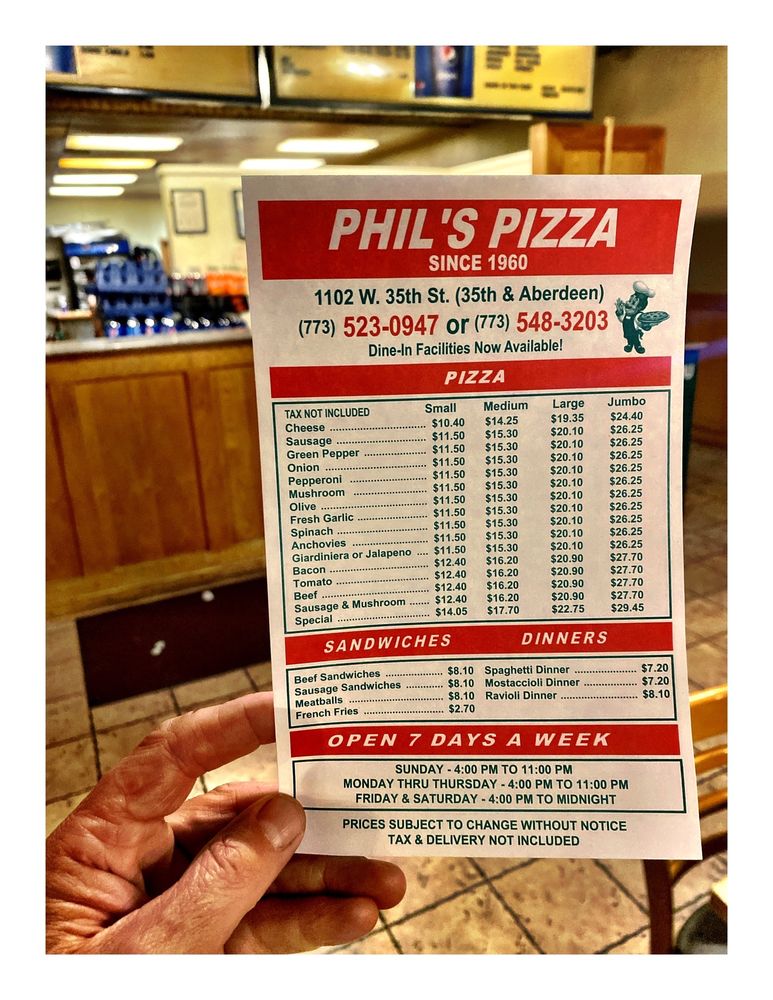 Phil's Pizza, located in Chicago, is a hidden gem known for its authentic and delicious Chicago-style pizza. Customers rave about the tender breaded steak sandwich, unique fennel-infused sausage, and flavorful thin-crust tavern pizza. The pizza sauce, made from Phil's own fennel recipe, is a standout feature that keeps patrons coming back for more. Despite some mixed reviews about the crust thickness, overall, the menu remains true to its original recipe and offers a satisfying dining experience. With a casual atmosphere, good for groups and kids, Phil's Pizza is a Southside favorite that delivers on taste, quality, and value. If you're in the mood for classic Chicago fare with a special twist, Phil's Pizza is a must-try for pizza lovers.